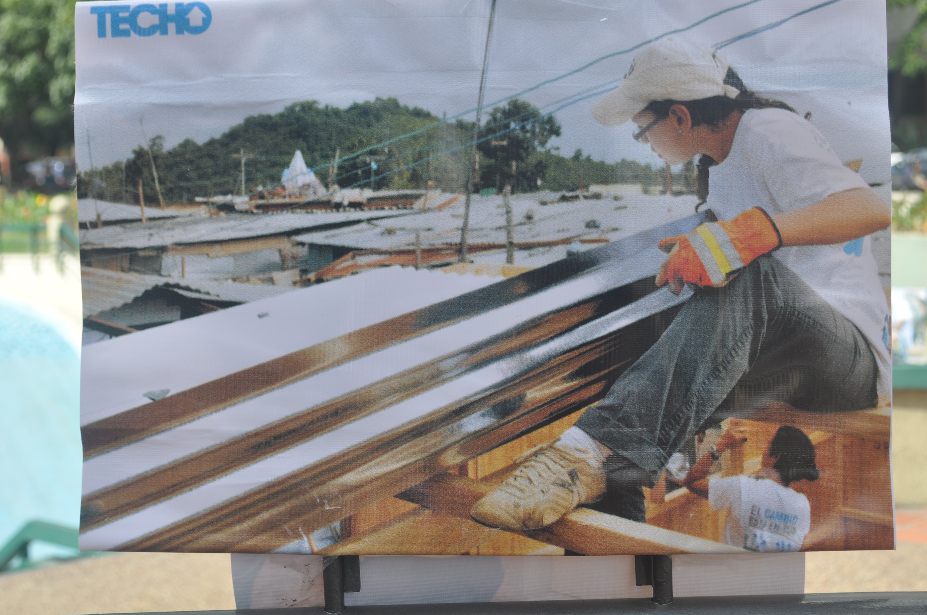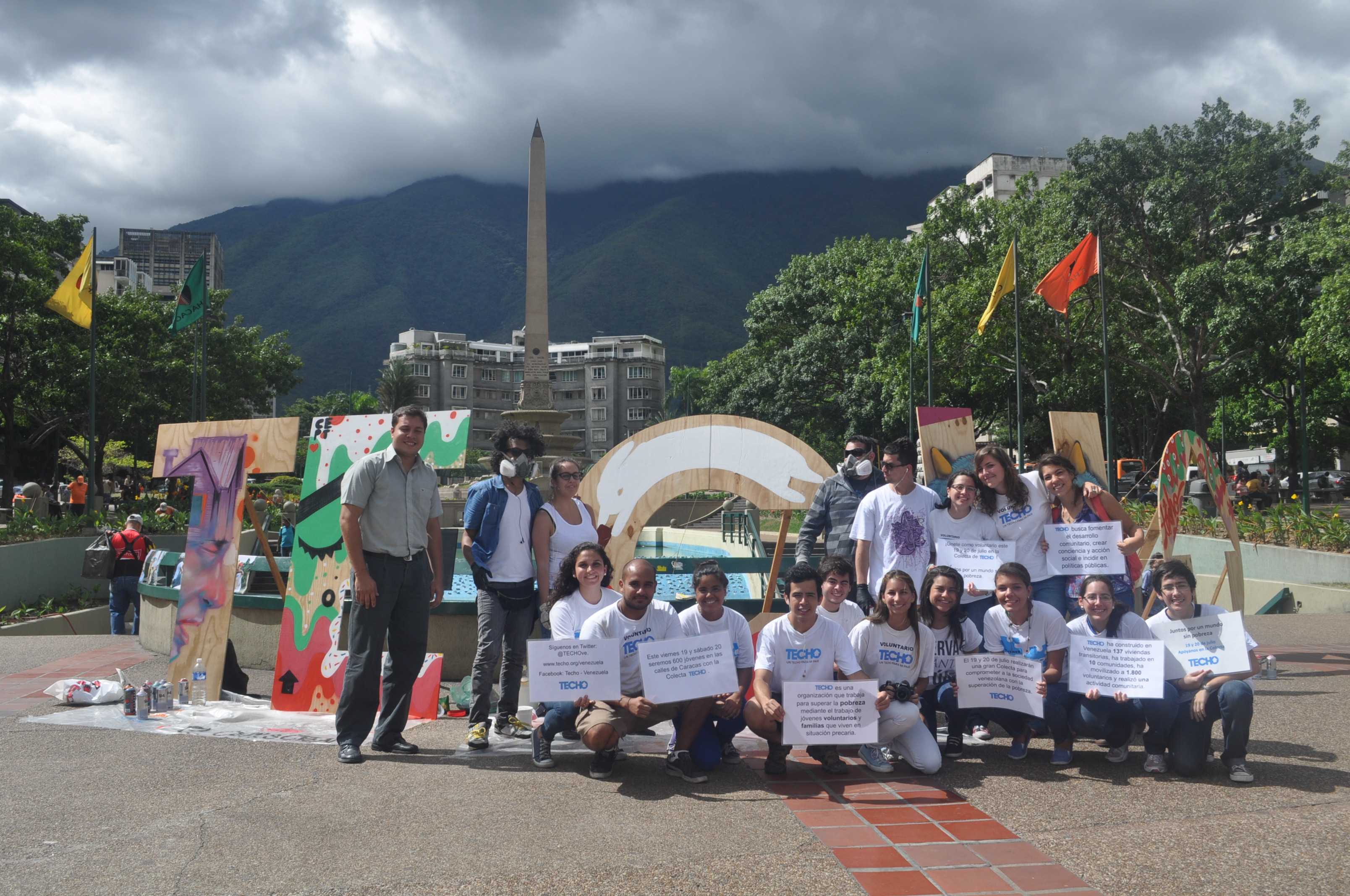 Verónica Alvarado, quien es especialista en realizar obras con pintura acrílica, y bajo los pseudónimos de Cept2, Sr. Peek y Okso, expertos en spray y creación de graffitis, intervinieron las cinco letras que forman la palabra TECHO para hacer un llamado a la sociedad venezolana sobre la importancia del trabajo en conjunto para superar la pobreza.