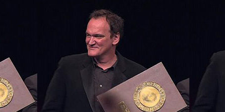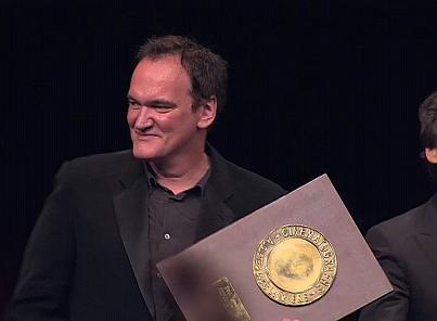 Uma Thurman, protagonista de Kill Bill y Pulp Fiction hace entrega del galardón al director de Django encadenado rodeado de sus amigos: Harvey Keitel, Tim Roth y los productores Laurence Bender y Harvey Weinstein.