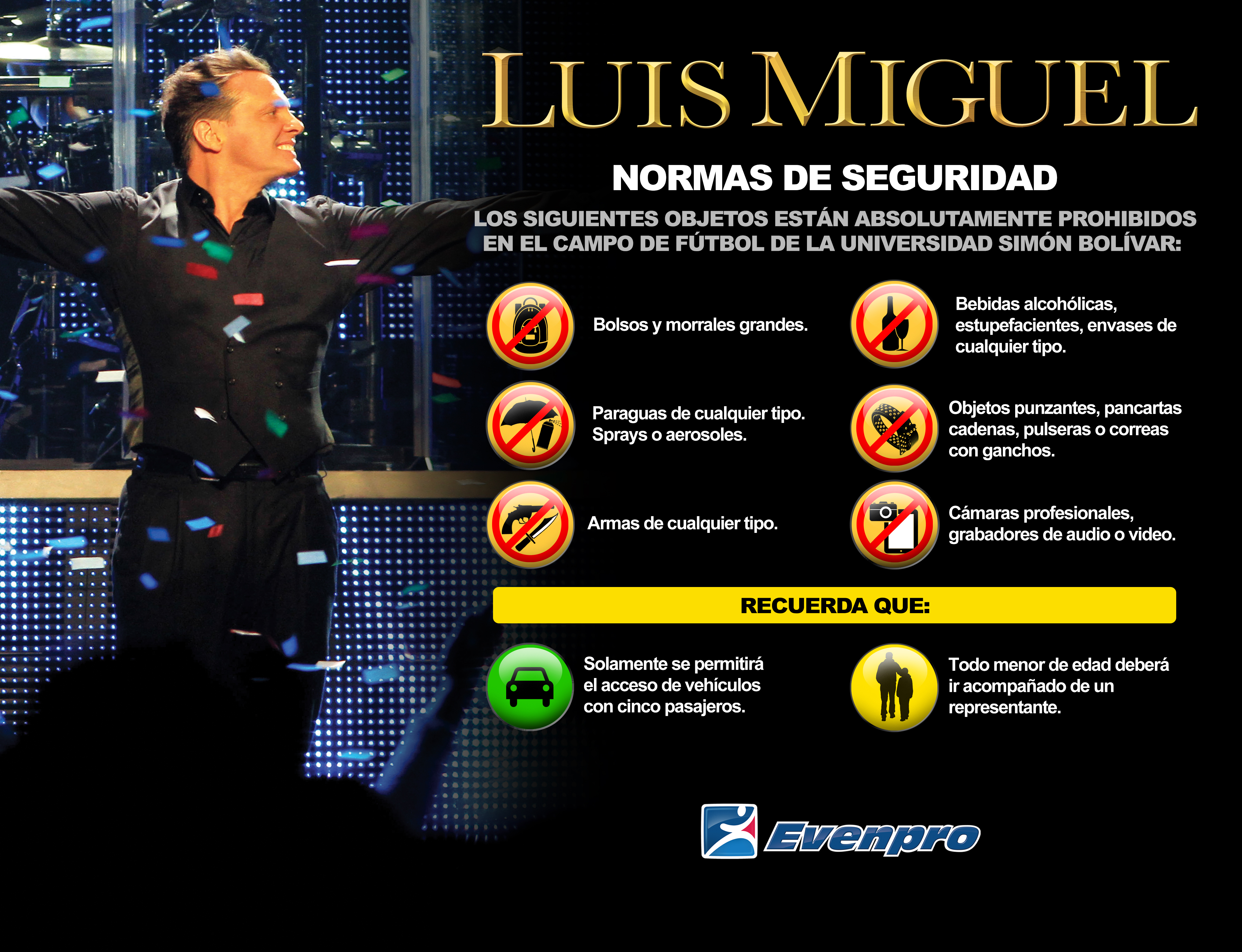 Entre las normas de seguridad de los conciertos de Luis Miguel, el público debe saber que a las locaciones está prohibido el ingreso de bolsos y morrales grandes, bebidas alcohólicas, y envases, paraguas, ni cámaras profesionales. Además todo menor de edad debe ir acompañado de un representante.