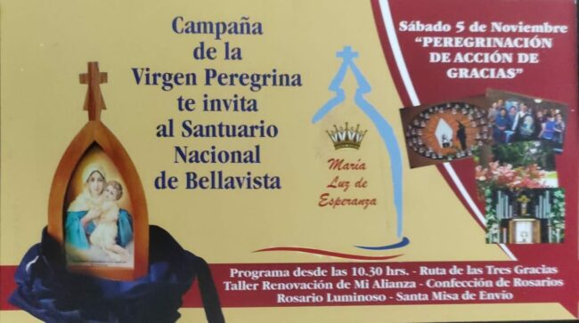 Imágenes El sábado 5 de noviembre se cumplió la Campaña de la Virgen Peregrina te invita al Santuario Nacional Cenáculo de Bellavista (SCHOENSTATT) Desde las 10hrs hubo un hermoso compartir con los hermanos en Cristo que como católicos le damos las gracias a María Madre de Dios y Madre nuestra. “Peregrinación de Acción de Gracias”…